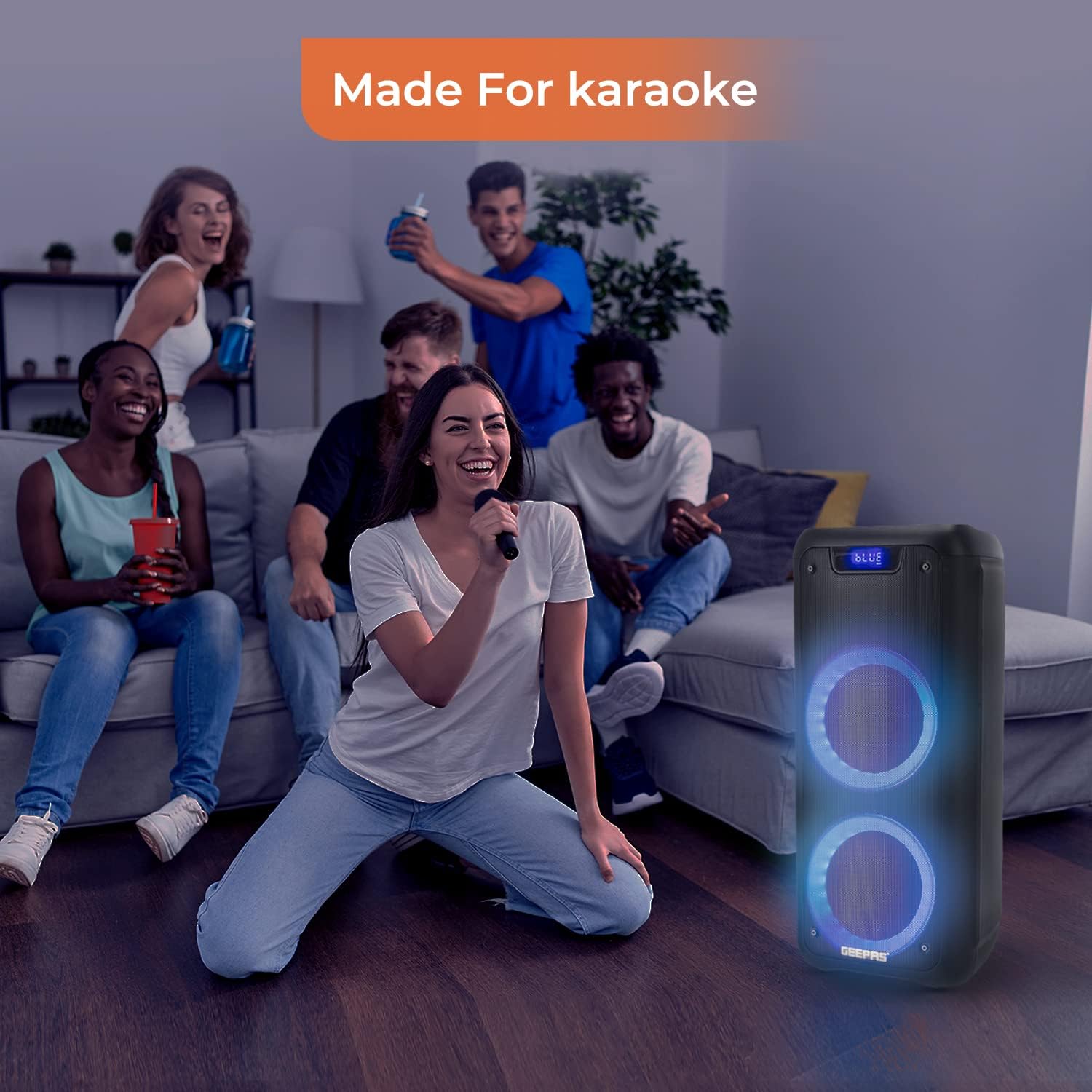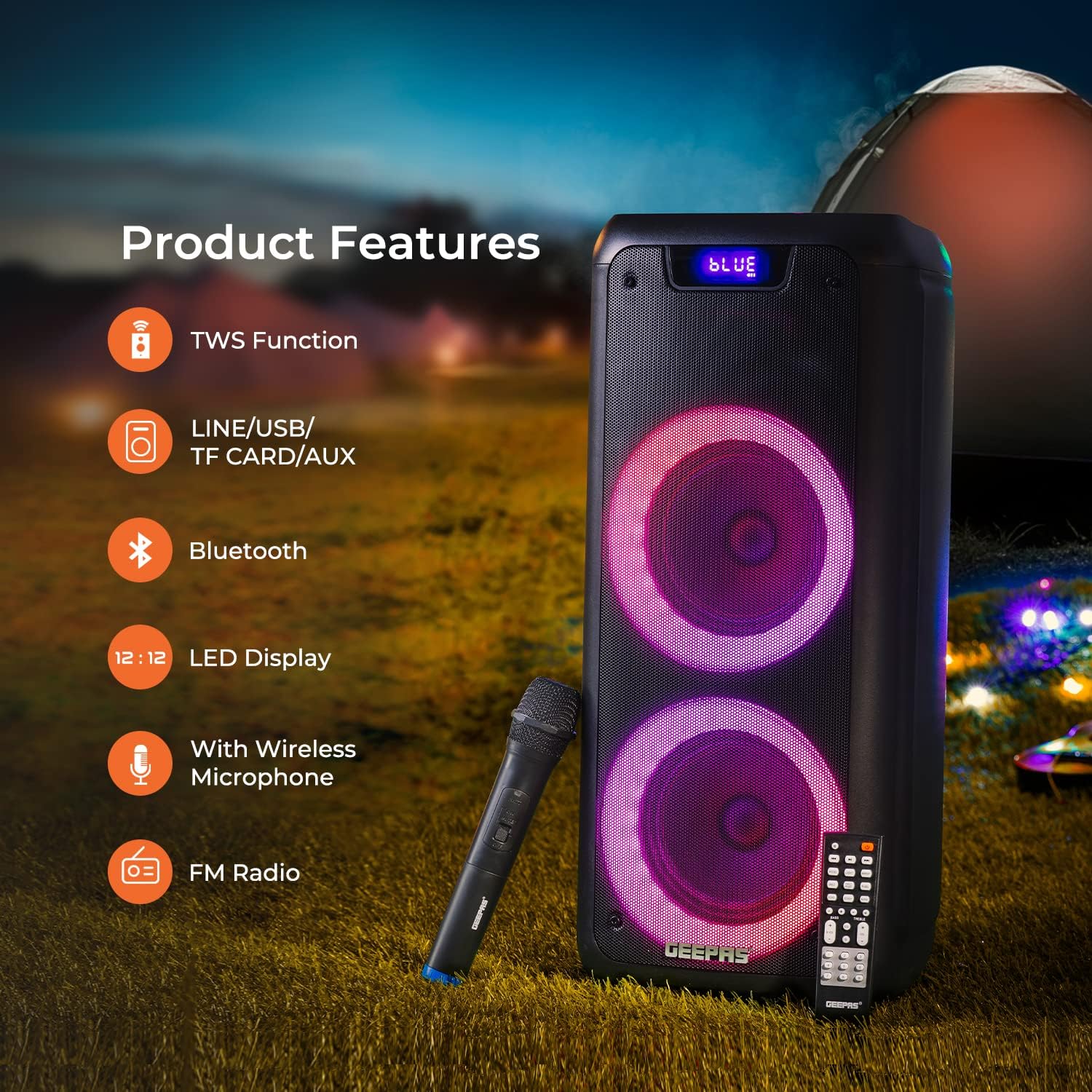 Geepas Rechargeable Professional Speaker, 40000W PMPO, GMS11168 | TWS Connection, BT/FM/USB/TF Card | LED Display | Wireless Microphone | 7.4V/3000mAh Lithium Battery.